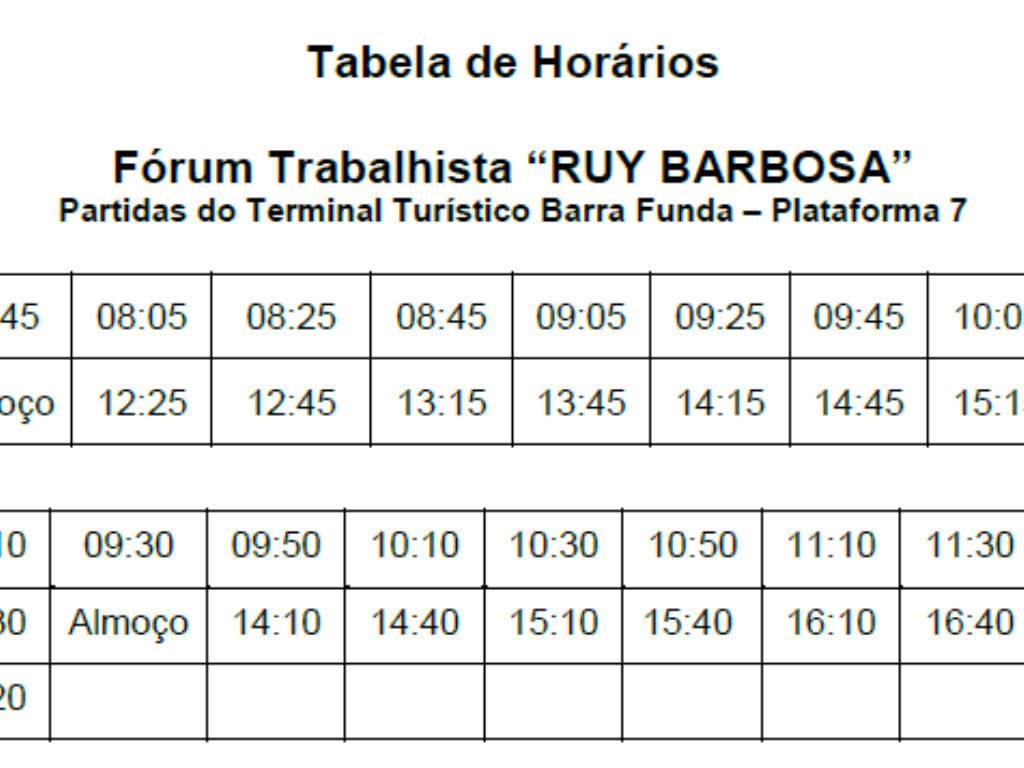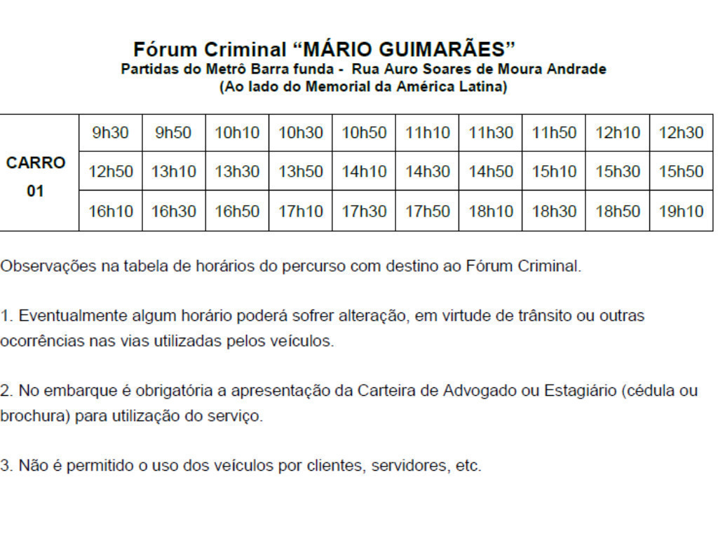 O serviço de transporte gratuito da OAB SP (Ordem dos Advogados do Brasil Seção São Paulo), operado pela empresa Jumbo Turismo, que atende o Fórum Trabalhista Ruy Barbosa e o Fórum Criminal Mário Guimarães, passou por alterações nos horários.