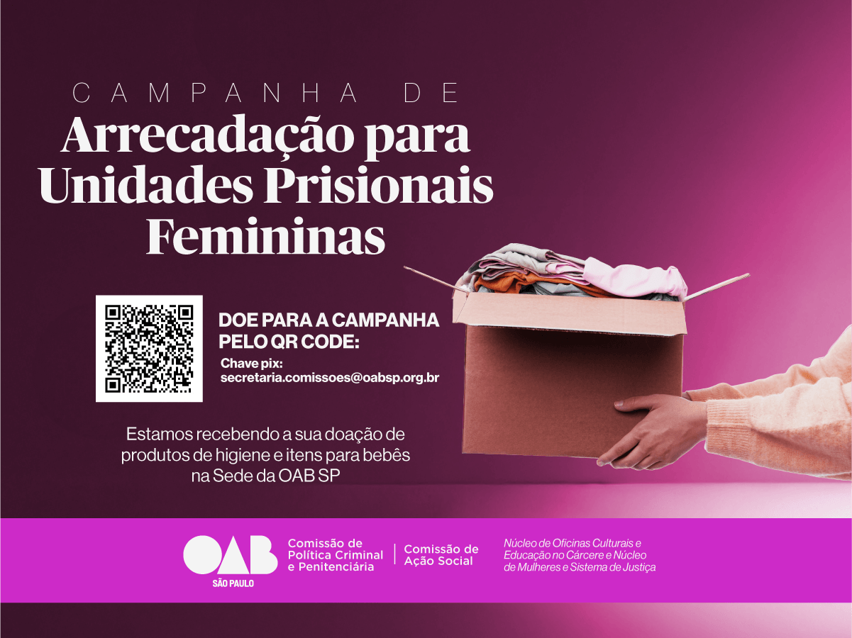 De 10 de outubro a 15 de novembro, a OAB SP (Ordem dos Advogados do Brasil Seção São Paulo), por meio da Comissão de Política Criminal e Penitenciária, em parceria com a Comissão de Ação Social e Cidadania, promove a arrecadação de itens a serem doados a mulheres mães em privação de liberdade.