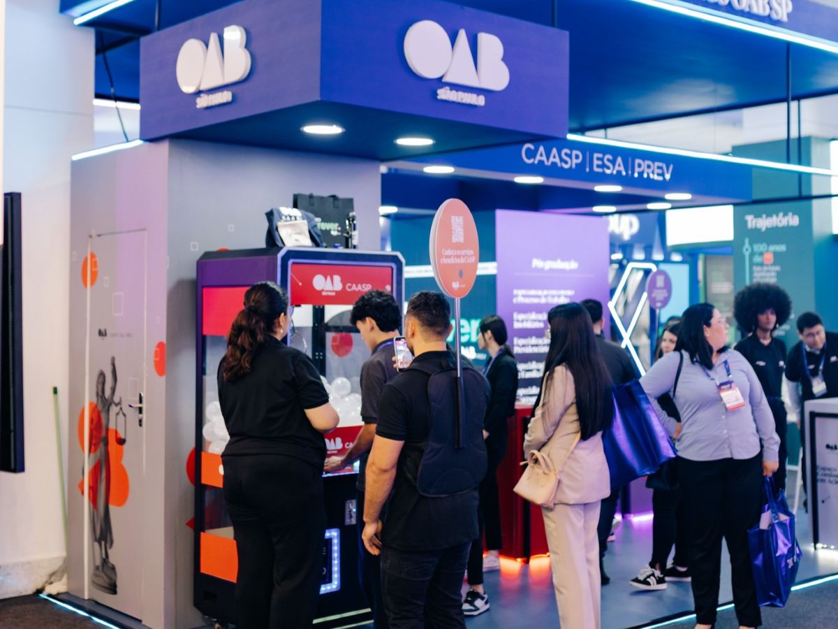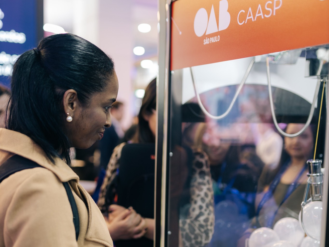 A decoração com iluminação azul e os logos de OAB SP, CAASP, OABPrev-SP e ESA exibidos em telas de led chama bastante a atenção dos visitantes da feira. Colaboradores treinados estão espalhados pelo local, com um chamativo adereço de identificação, prontos para explicar cada um dos serviços. Mas o ponto alto, além do cafezinho indispensável para atrair o público, é uma máquina de garras para pegar bolinhas. Qualquer um pode arriscar a sorte. E dentro das bolinhas, é claro, brindes e descontos especiais para os produtos e serviços das instituições que compõem o Universo OAB.