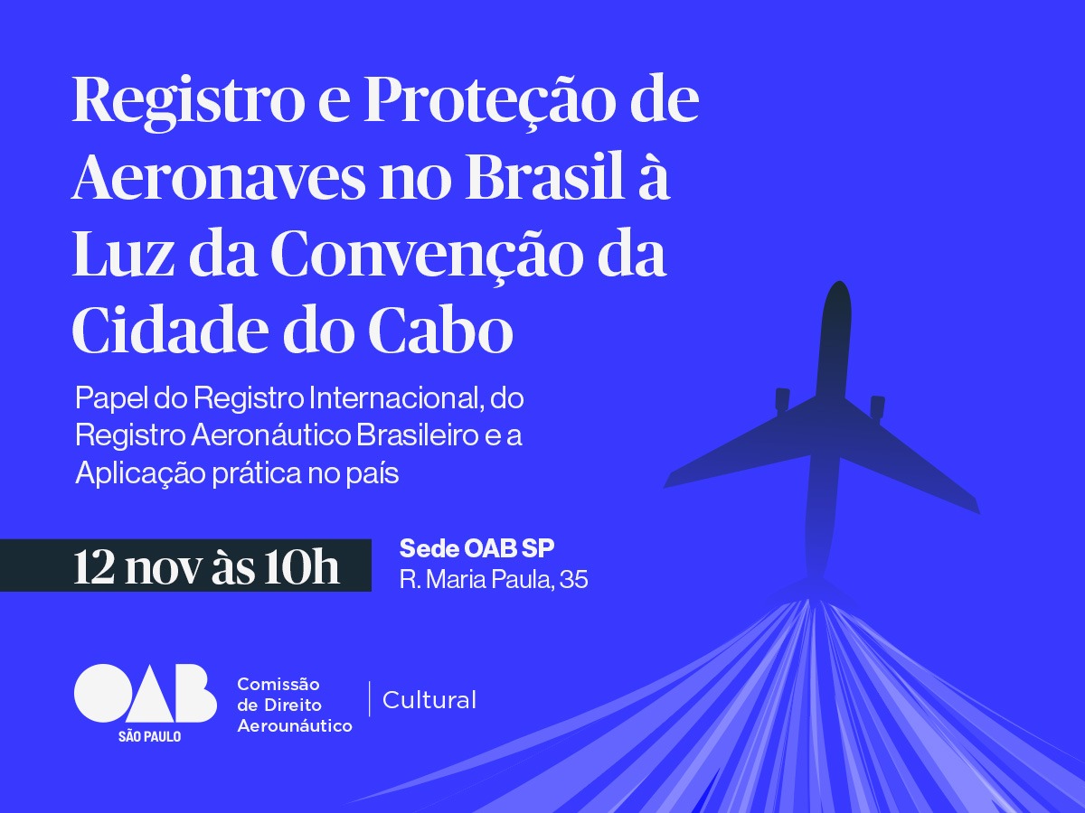 A Comissão de Direito Aeronáutico da OAB SP (Ordem dos Advogados do Brasil Seção São Paulo) realizará, na próxima quarta-feira (12), a palestra “Registro e Proteção de Aeronaves no Brasil à Luz da Convenção da Cidade do Cabo”. Sob a coordenação da presidente da Comissão, Roberta Fagundes Leal Andreoli, que fará a abertura do evento, a palestra contará ainda com a exposição da integrante da Comissão Nicole René Gomes e Cunha, que abordará a atuação do Registro Internacional e do Registro Aeronáutico Brasileiro e sua aplicação no contexto nacional.