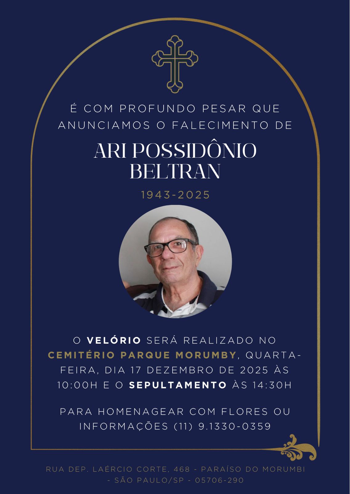 O velório será realizado no Cemitério Parque Morumby, nesta quarta-feira (17), a partir das 10h, e sepultamento, no mesmo local e dia, às 14h30.