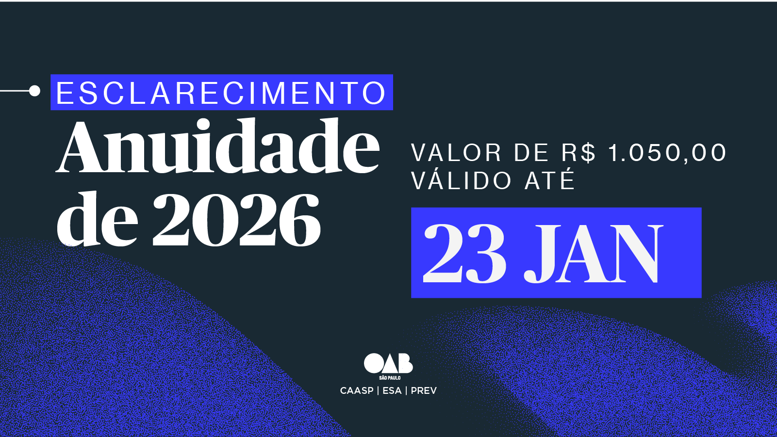 A OAB SP informa que a advocacia do estado de São Paulo poderá realizar o pagamento da Anuidade 2026, no valor de R$ 1.050,00, piso fixado pelo Conselho Federal, até o dia 23 de janeiro de 2026.